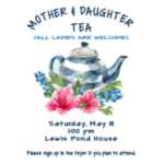 | 17 | 18 1:00 PM-3:00 PM 05/18/2019 https://fbcscreven.org/event/mother-daughter-tea/2019-05-18/  Saturday May 18, Lewis Pond House Please sign up in the foyer if you plan to attend.